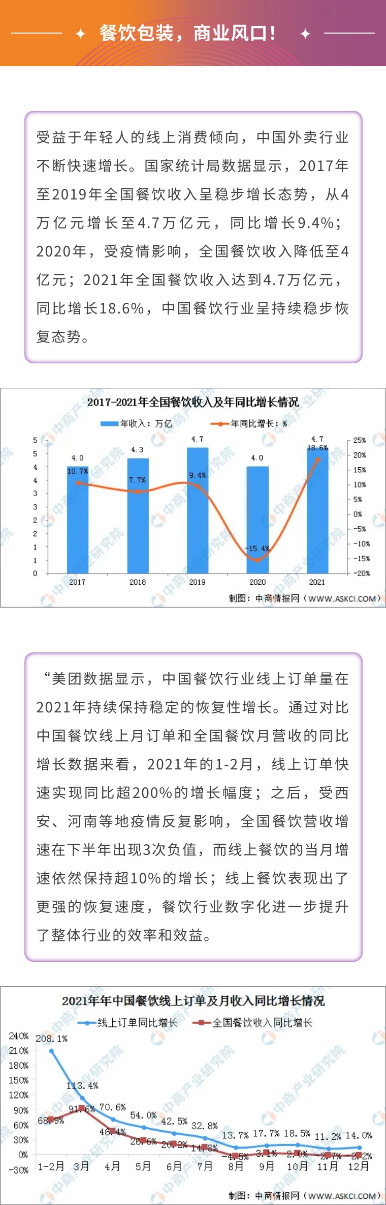 疫情發(fā)生這三年以來,許多行業(yè)都遭受到很大的打擊,而餐飲包裝的恒久不衰在于它服務(wù)于人們吃飯這件“剛需事”。隨著社會(huì)生活水平的提高,人們對于食物的需求不僅僅停留在飽腹這一層面上,對于餐飲包裝的設(shè)計(jì)要求也是越來越高。餐飲包材的升級,這意味著包裝業(yè)還蘊(yùn)藏著巨大的商機(jī)!