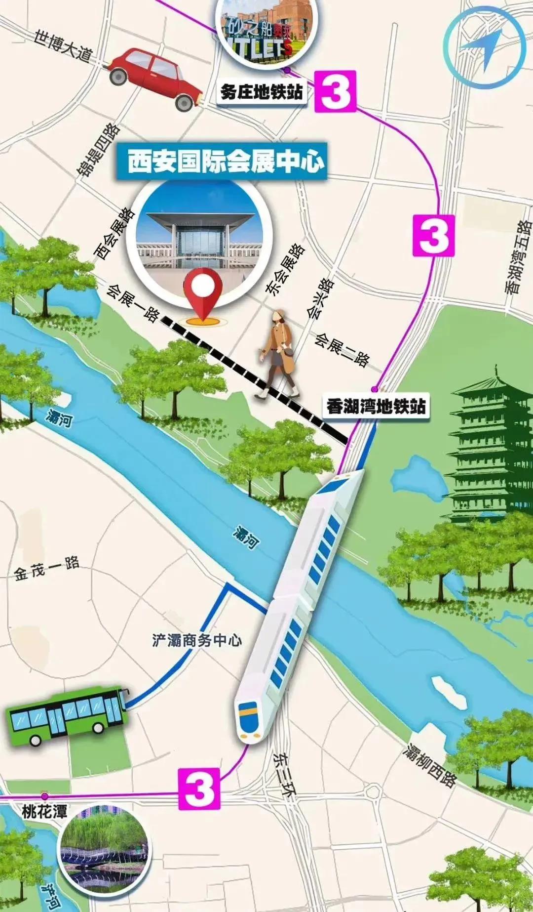 乘坐地鐵3號線至香湖灣地鐵站B2口→乘坐擺渡車前往西安國際會展中心